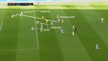 Merino und José laufen in die Tiefe und bieten sich für einen Pass im Rücken der Abwehr an. Doch Ødegaard täuscht einen Schuss an und passt zu Portu, der von außen tororientiert einläuft.