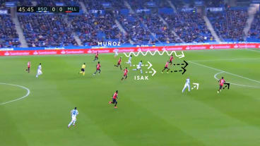 Le Normand und Merino bieten sich innerhalb ihrer Spur an, stehen jedoch unter direktem Gegnerdruck. Der AMF rückt weiter an Muñoz heran, woraufhin dieser zu Barrenetxea in die Tiefe passt, der jedoch eng vom Außenverteidiger (AV) verfolgt wird.