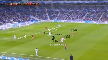 Ødegaard kappt vor dem ZDM ab, passt zu Merino und läuft in den Raum zwischen der Abwehr- und Mittelfeldlinie. Dort fordert er einen Pass von Merino, den er auch erhält.