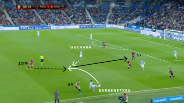 Barrenetxea passt unter Druck des AVs in die Mitte. Der zentrale defensive Mittelfeldspieler (ZDM) erkennt die Absicht, kommt vor Guevara an den Ball und passt zum Stürmer (ST) in die Tiefe.
