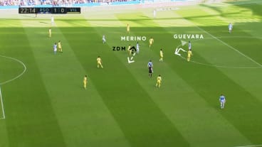 Der zentrale defensive Mittelfeldspieler (ZDM) rückt an Merino heran. Guevara setzt sein Dribbling fort und orientiert sich nach außen. Daraufhin passt der ZDM seine Position an und bewegt sich von Merino weg.