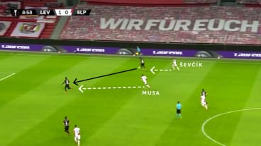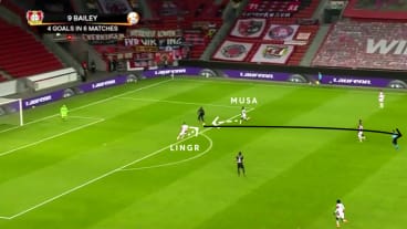 Mit dem Pass laufen Musa und Lingr den Passempfänger an. Aufgrund des Drucks spielt der Gegner einen unkontrollierten langen Ball, ...
