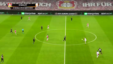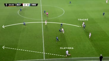 Traoré spielt mit dem ersten Kontakt einen Tiefenpass in den Lauf von Olayinka.
