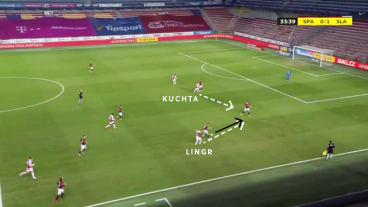 Lingr setzt seinen Gegenspieler unter Druck und erzwingt einen Rückpass. Kuchta antizipiert dies und läuft den Passempfänger an.
