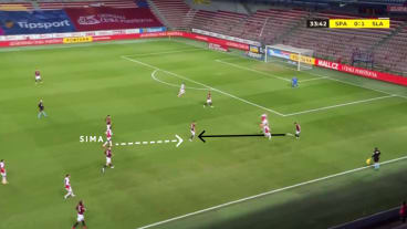 Beim Herausspielen und Verwerten von Torchancen nutzt Slavia Prag häufig die Assist-Zone neben dem Strafraum. Von dort werden flache Ablagen in den Rückraum gespielt, die die eingelaufenen Mitspieler mit dem ersten Kontakt aufs Tor abschließen. In diese Assist-Zone gelangt Slavia Prag zumeist durch Dribblings der Außenstürmer, die über hervorragende 1-gegen-1-Qualitäten verfügen, oder nach Schnittstellenpässen auf die hinterlaufenden Außenverteidiger.