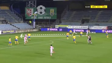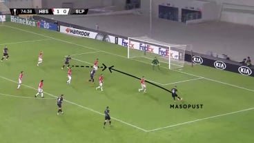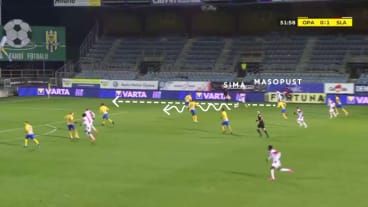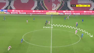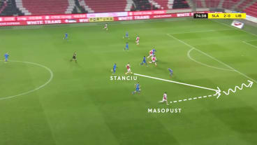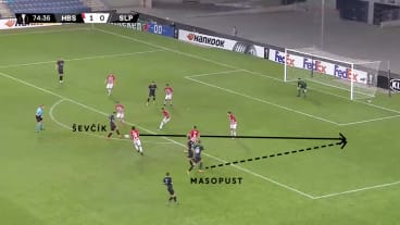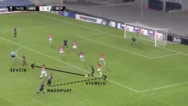 Stanciu passt zu Ševčík in die Zentrumsspur. Masopust hinterläuft Stanciu und startet in den Strafraum.