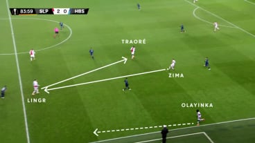 Zima passt zu Lingr, der den Ball auf Traoré klatschen lässt. In der linken Außenspur startet Olayinka in die Tiefe.