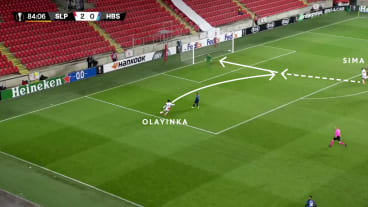 Olayinka erreicht den Ball am Strafraum und passt in die Zentrumsspur zum eingelaufenen Sima, der aufs Tor abschließt.