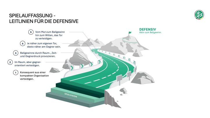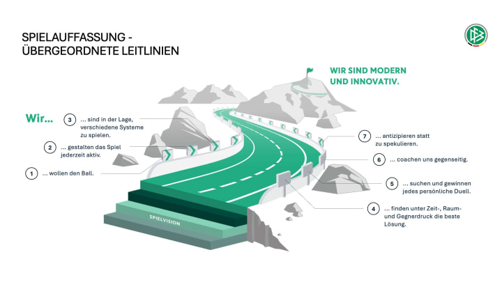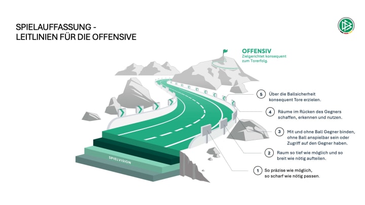 Die Spielvision ist unterteilt in übergeordnete, offensive und defensive Leitlinien. Die Leitlinien der Spielauffassung formulieren somit auch klare Orientierungspunkte für alle DFB-Teams von der U15 bis zur A-Nationalmannschaft. Diese konkreten „Erfolgsregeln“ müssen dabei variabel in konkreten Spielsituationen umgesetzt werden. Musterszenen aus Spielen diverser männlicher und weiblicher U-Teams zeigen anschaulich wie die Spieler*innen in verschiedensten Phasen des Spiels auf Basis der Leitlinien jeweils eine flexible, angepasste Lösung finden.