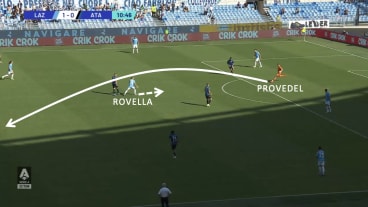 Provedel spielt einen Chipball in den linken Halbraum. Rovella öffnet diesen zusätzlich durch sein Entgegenkommen.