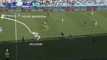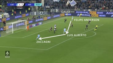 Zaccagni dribbelt mit der Ballannahme in die Zentrumsspur und passt in die rechte Außenspur in den Lauf von Felipe Anderson.