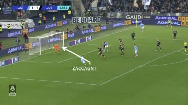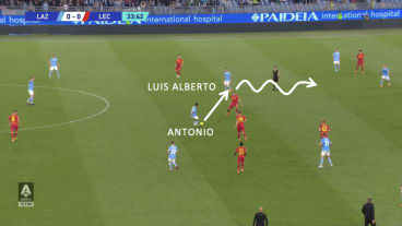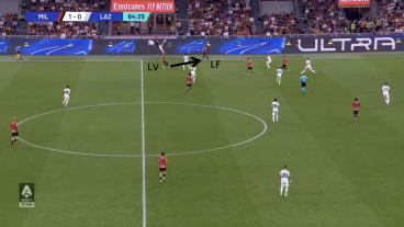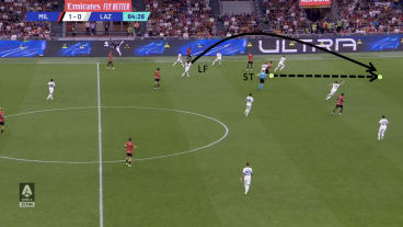 Da die Abwehrkette von Lazio hochsteht, ohne dass genügend Druck ausgeübt wird, kann der LF einen Chipball auf den Stürmer (ST) spielen.