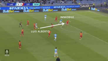 Im Aufbau sucht Lazio fast immer spielerische, flache Lösungen im 4-3-3. Dabei stehen die Außenverteidiger zumeist etwas flacher und bilden mit den beiden Innenverteidigern und einem fallenden Sechser/Achter eine 4-1-Aufbaustruktur. Die anderen beiden zentralen Mittelfeldspieler stehen grundsätzlich etwas höher im Halbraum – lassen sich bei Bedarf (sehr intensives gegnerisches Angriffspressing) jedoch ebenfalls fallen, um eine zusätzliche Anspielstation im Spielaufbau zu bieten. In dieser Struktur versucht Lazio, im Idealfall über Steil-Klatsch-Aktionen und im Spiel über den Dritten, einen freien Mann im Zentrum zu finden und anschließend in die Außenspur in eine 1-gegen-1-Situation zu verlagern.