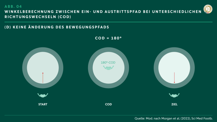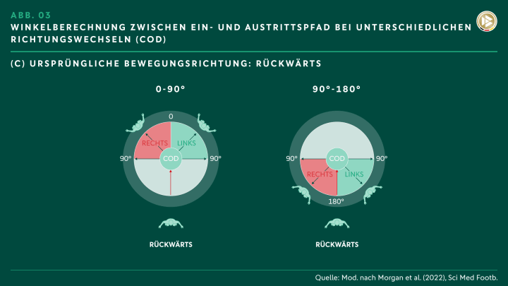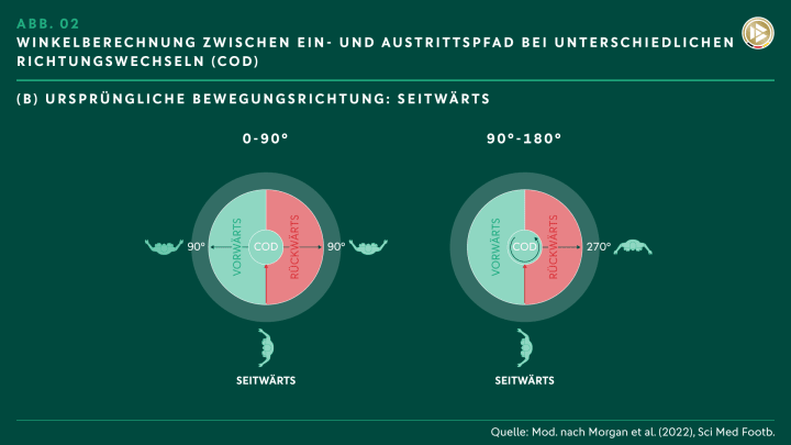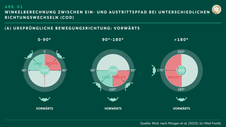 Bei der Erfassung der Richtungswechsel während der Spiele wurden nur Situationen berücksichtigt, bei denen der betreffende Spieler nicht den Ball führte. Neben der reinen Anzahl an Richtungswechseln wurden ebenfalls deren Winkel (< 90°, 90-180°, > 180°) und Richtung (links/rechts, vorwärts/rückwärts) bestimmt (vgl. ABB. 01). Um ein möglichst umfassendes Bild zu erhalten, analysierten die Forscher alle genannten Parameter hinsichtlich der Spielposition, der Füßigkeit und der anthropometrischen Merkmale (Größe und Gewicht) der Spieler sowie in Abhängigkeit der Spielminute.