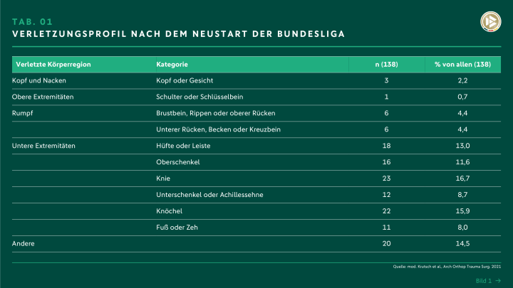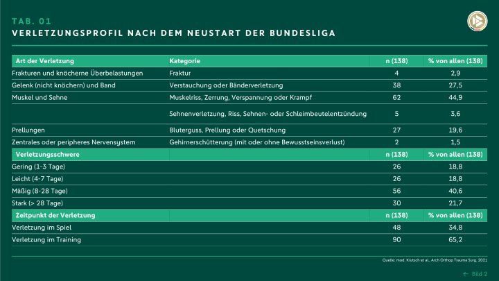 - Die unerwartete Saisonunterbrechung durch den Corona-Lockdown im Jahr 2020 hatte keinen negativen Einfluss auf die Verletzungshäufigkeit nach dem Neustart der Bundesliga.