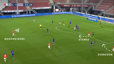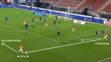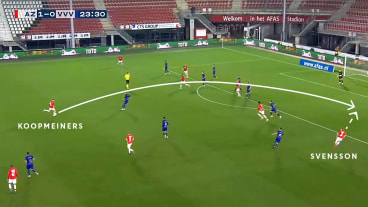 Daraufhin spielt Koopmeiners einen präzisen Diagonalpass in Svenssons Lauf. Mit dem Pass rücken die überspielten AZ-Angreifer, u. a. de Wit, in den Strafraum nach.