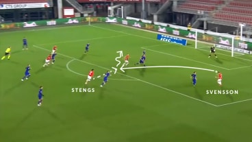 Svensson erläuft das Zuspiel und köpft direkt in den Rückraum, wo Stengs, der nach seiner Voraktion nachgerückt ist, zum Tor an- und mitnimmt ...