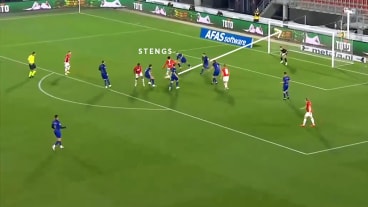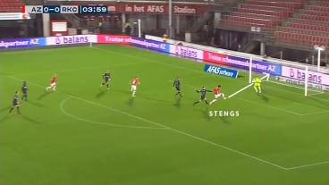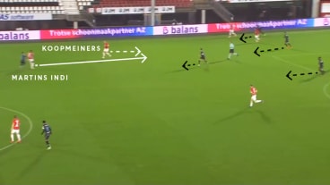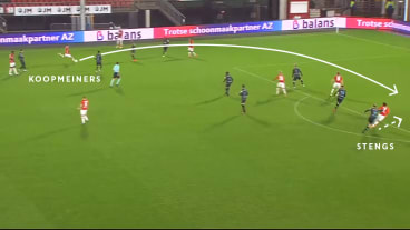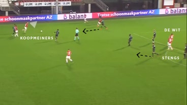 Beim Versuch den Ball zu erobern, hat sich die gegnerische Defensive stark zum ballführenden AZ-Spieler zusammengezogen. Dies hat zwar Erfolg, doch der Ball landet nach der Grätsche umgehend bei Koopmeiners, dem die Desorganisation bewusst ist und diese mit einem Pass zu Steng umgehend bespielt.