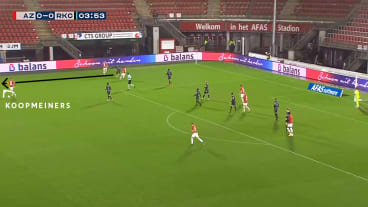 Nach einem Ballverlust geht AZ umgehend ins Gegenpressing und setzt den ballführenden Gegenspieler unter Druck, der daraufhin einen Pass in die Tiefe spielt. Koopmeiners spekuliert bereits auf ein solches Zuspiel, doch er kann den scharfen Pass nicht abfangen.