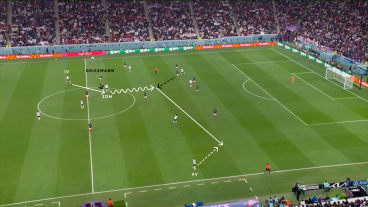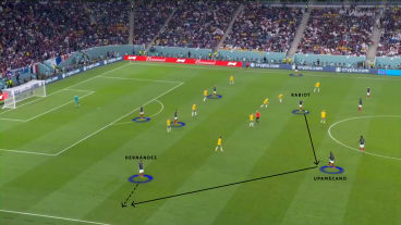 Mit dem Pass zum ZM schiebt Giroud nach vorne, wodurch das Zentrum von Frankreich inklusive Rabiot verschieben muss. Daraufhin lässt sich Griezmann zurückfallen und füllt die Lücke, stabilisiert so das Zentrum. Nach einer Passabfolge passt der ZM zum linken Innenverteidiger (IV).