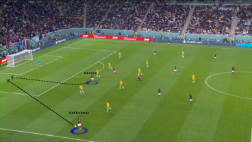 Frankreich agiert gegen ein kompakt formierten Gegner aus einer sauberen Raumaufteilung heraus. Dadurch haben sie die Möglichkeit, sich den Gegner im abgestimmten Zusammenwirken und mit Geduld zurechtzulegen. So passt Rabiot zu Upamecano, der mit einem sauberen Pass den in der Außenspur freistehenden Hernandéz in Szene setzt.