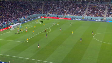Mbappé erläuft das Zuspiel und schließt mit dem ersten Kontakt ab. Der Torschuss verfehlt jedoch das Tor und der Ball rollt entlang der Grundlinie. Dembélé nimmt den 'losen' Ball auf, ...