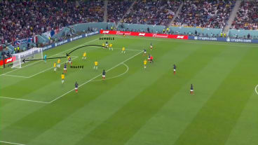 Mit der Annahme von Hernandéz startet Mbappé einen Lauf in die Tiefe, wodurch die Situation sofort an Dynamik gewinnt. Hernandéz erkennt Mbappés Laufweg frühzeitig und passt in dessen Lauf.