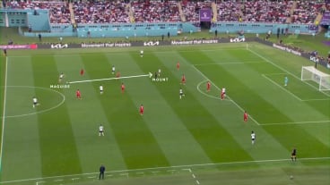 Maguire passt zu Mount, der zwischen der gegnerischen Abwehr- und Mittelfeldlinie anspielbar ist.