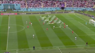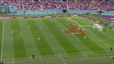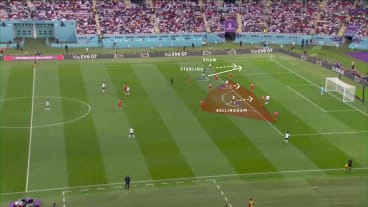 Durch das abgestimmte Zusammenwirken können sie die Überzahl nutzen und Shaw in der Außenspur frei spielen, den Sterling mit seinem Pass in Szene setzt. Mit dem Pass rückt Bellingham, der ohne Gegnerdruck ist, in den Strafraum nach.