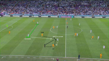 Spielaufbau des Gegners: In der ersten Phase nimmt Argentinien eine relativ tiefe Positionierung in einer flexibel angepassten Fünferkette ein. Die vorderen beiden Angreifer üben wenig Druck aus, sodass der Gegner bereits einen Pass zum Außenverteidiger (AV) spielen konnte. Mit diesem Pass steigert Argentinien den Druck. Mac Allister läuft den AV an, der daraufhin einen Doppelpass mit dem zentral-defensiven Mittelfeldspieler (ZDM) spielt, der von Álvarez unter Druck gesetzt wird.