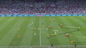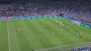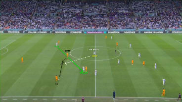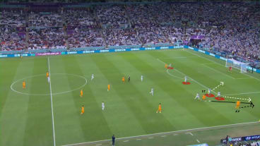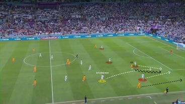 Argentinien hält die defensive "Dynamik", die durch den initialen Diagonalpass zum AV ausgelöst wurde, weiterhin hoch. Der ZDM im Zentrum, der den Pass vom AV erhält, wird von de Paul umgehend angelaufen.