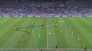 Stattdessen übernimmt Rabiot aus dem Zentrum heraus das Verteidigen der linken Seite und agiert als Unterstützer für Hernandéz. Da der ZM sich jedoch für ein diagonales Dribbling in die Zentrumspur und einem Pass zum zentral-offensiven Mittelfeldspieler (ZOM) entscheidet, ist in diesem Moment ein Herausrücken nach außen nicht nötig.