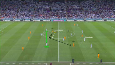 Daraufhin passt der ZDM zurück zum Innenverteidiger (IV), der den Pass zum Stürmer (ST) in die Tiefe sucht. Dieser wird bei der Annahme bereits von Romero unter Druck gesetzt und eng verfolgt.