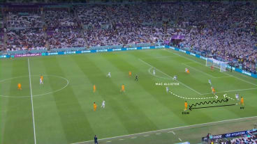 Der AV kappt ab und passt zurück zum ZOM, woraufhin Mac Allister aus dem Zentrum zur Hilfe eilt und Druck auf den Ballführenden ausübt. Der ZOM sucht daraufhin die Flucht nach vorne und dribbelt in Richtung Strafraum.