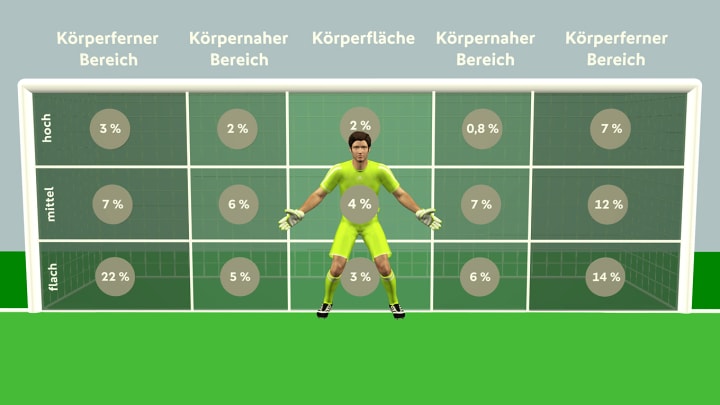 Trotzdem hat der Torhüter eine gute Kontrolle und verkleinert mithilfe des Vorschiebens das virtuelle Tor. Der unkonventionelle Abschluss aus dem Sprung erschwert jedoch die Verteidigungsaktion.